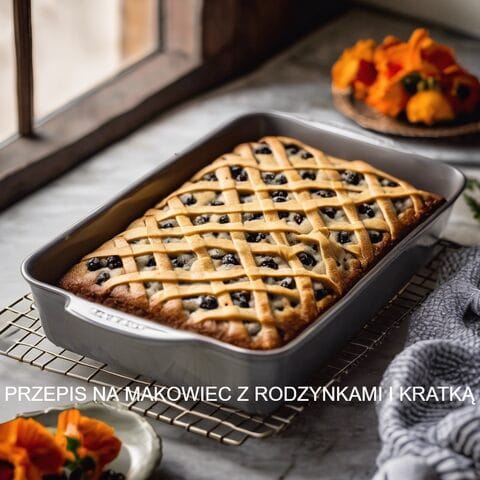PORADNIK – PRZEPIS NA MAKOWIEC Z RODZYNKAMI TRADYCYJNY Z KRATKĄ NA WIERZCHU CIASTA. PIECZONY W KLASYCZNEJ BLASZCE METALOWEJ O WYMIARACH 28 x 40 x 6 cm.